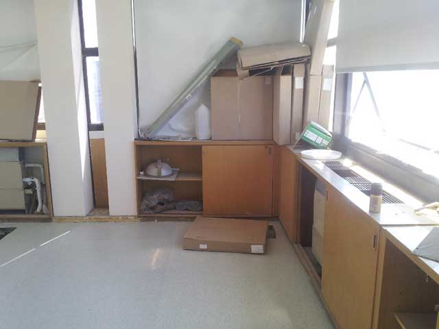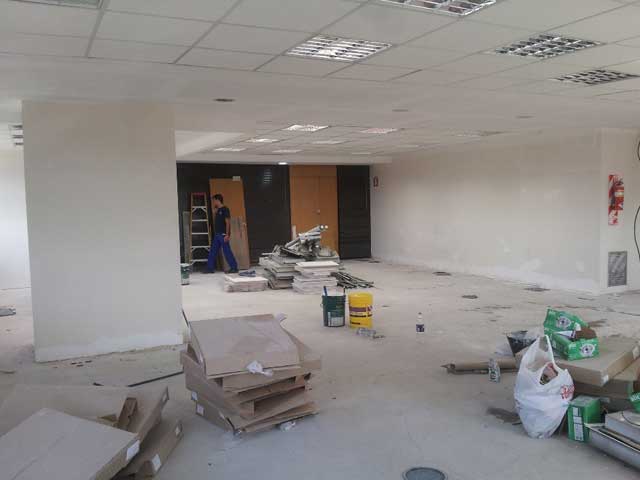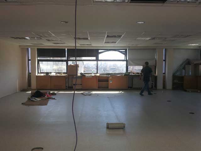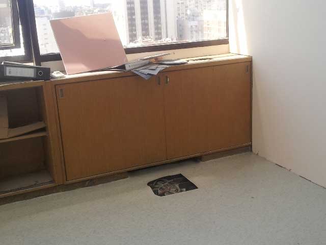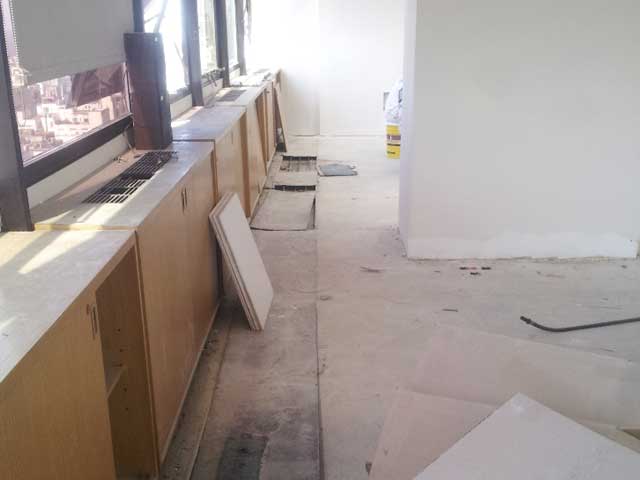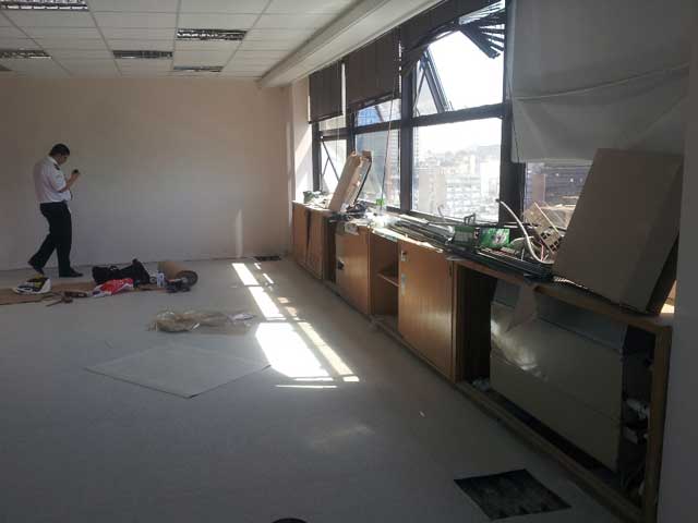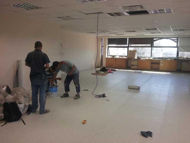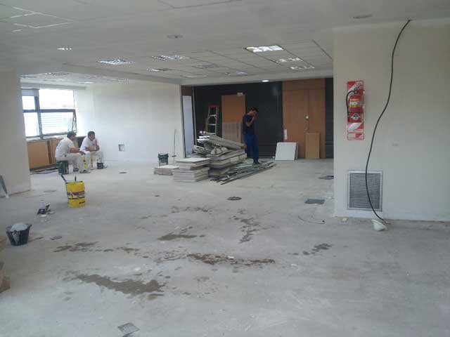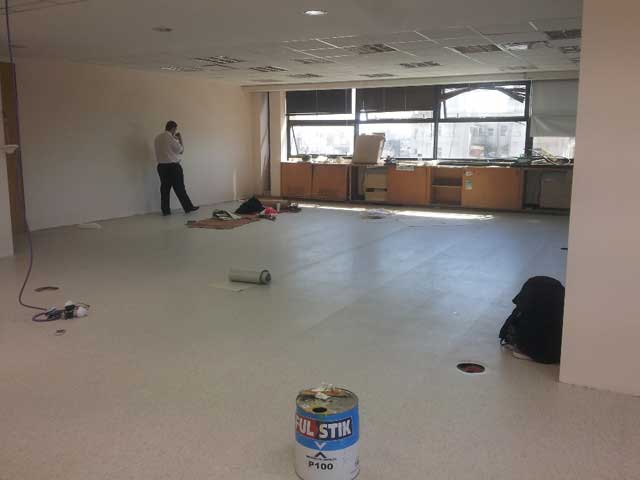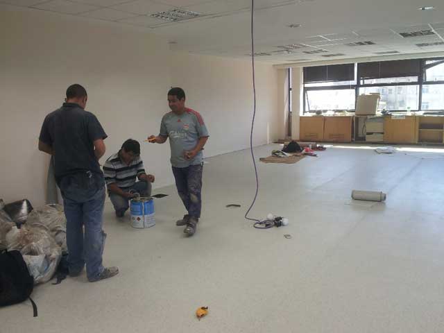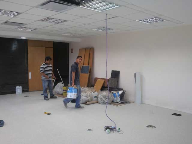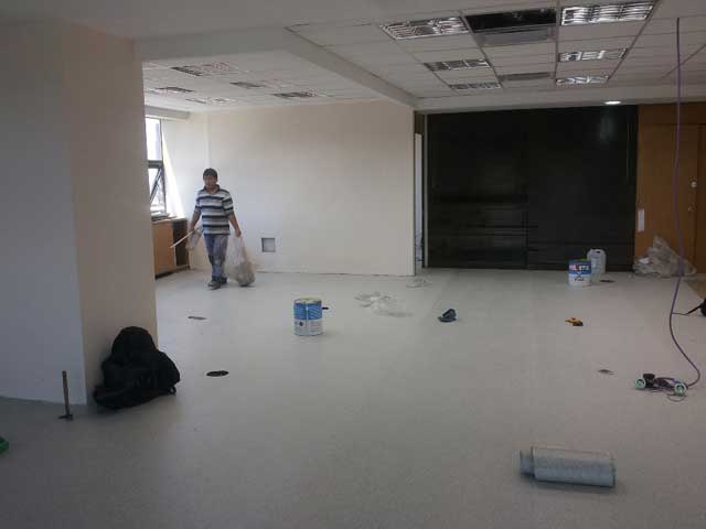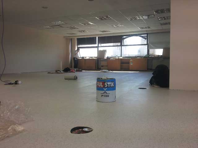 En esta obra se coloco un piso de goma modelo Sustenta MT color Caliza en rollos de 1120 x 2mm. En primer termino se aliso la superficie con masa niveladora y con masilla plástica se tomaron las chapas perimetrales al tratarse de una oficina con piso técnico. El color elegido nos brinda calidez y aumenta la amplitud gracias al tono y a la luz natural.